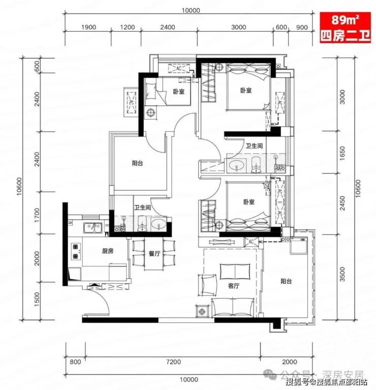B02户型:89㎡四房二厅二卫