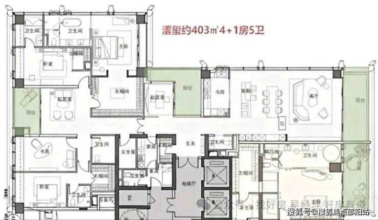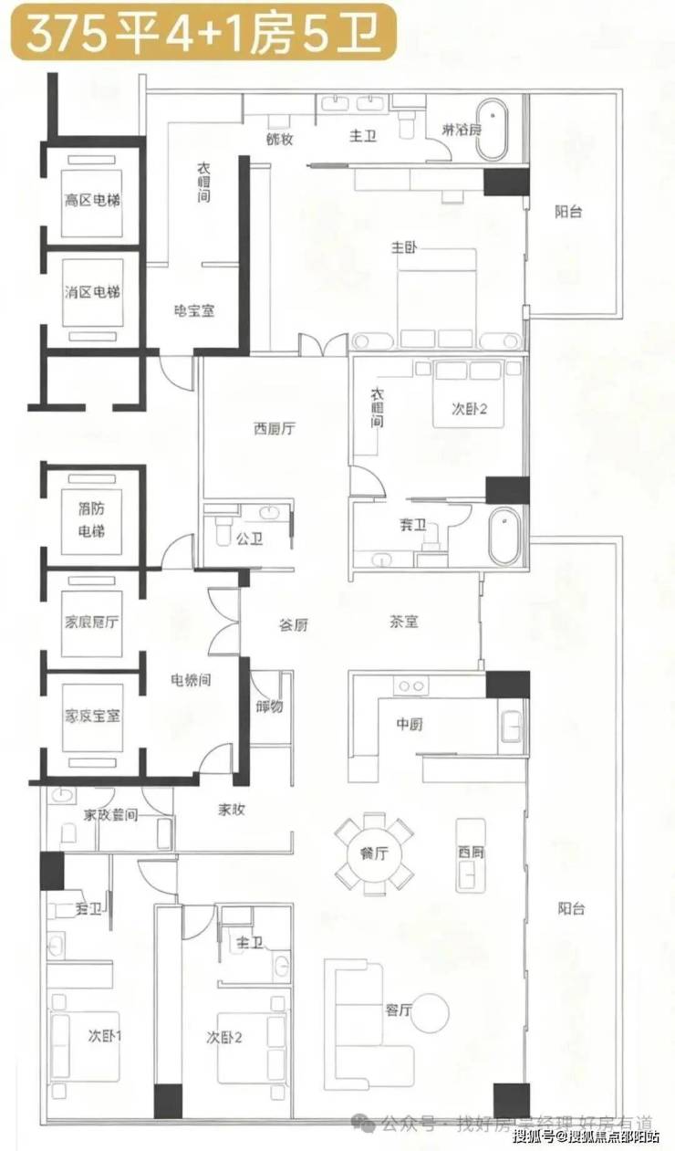 · 375㎡户型: 4+1房五卫设计,配备家庭厅和家政套间,适合有多样化生活需求的高净值家庭。