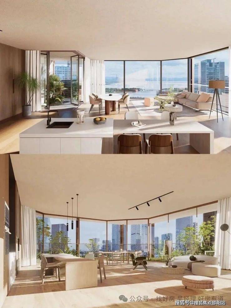 项目规划5栋超高层住宅,采用全玻璃幕墙设计,实用率超95%,主力户型为209㎡以上大平层。项目以“第四代住宅”标准打造,配备空中连廊、星空会所、架空泳池等共享空间,并融入垂直绿化体系