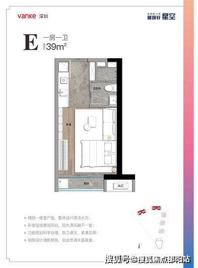 ①约39㎡产品:一居室户型,设计简洁大方、功能规划科学合理,厨卫俱全,紧凑实用;