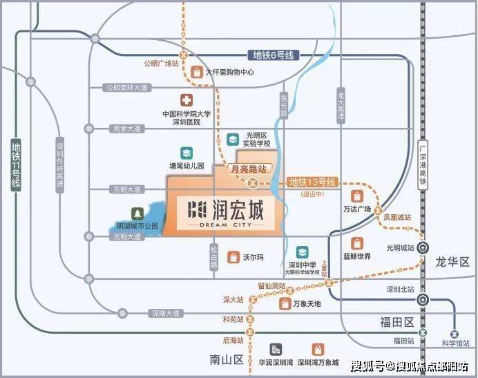 华润润宏城位于光明区凤凰街道塘尾社区,光明大道和东长路交汇处的西北侧,刚好在13号线“月亮路站”附近,北部接壤东周路。