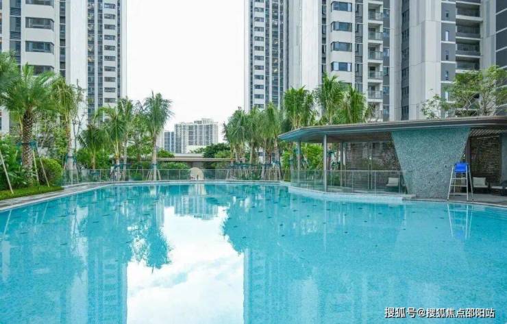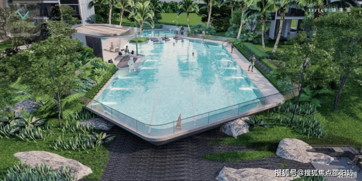 【异域度假感泳池】园林的中心,是悬浮泳池,也是巧妙融入了社区空间中的一面「天空之镜」,让园林纵向延伸。