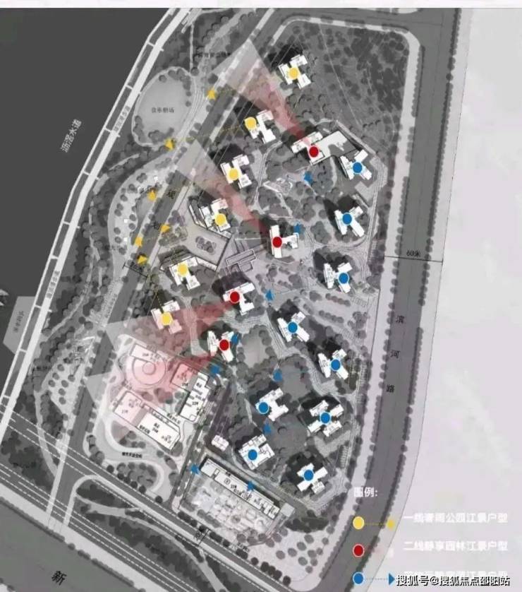 从规划图中可以看出,为了达到江景视野最大化的效果,项目楼栋规划为三排,整体向西侧扭转,错落分布。