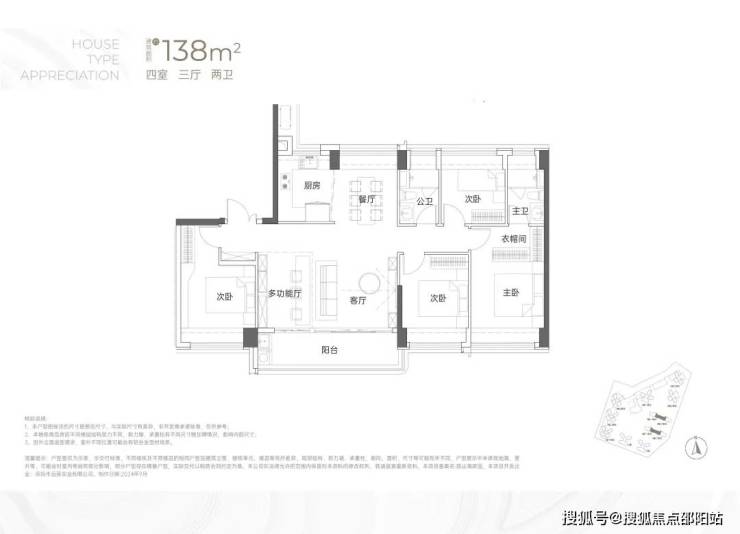 竖庭格局,西南向,基本居住功能与建面约108-110㎡4房2卫一致,但格局不一样,从目前公布的户型图上看,主要是主卧空间有了更大的提升,比如可以放更大一点的衣柜。