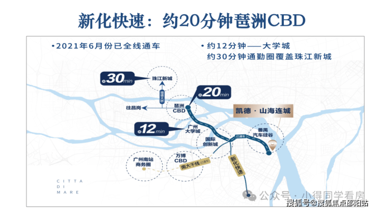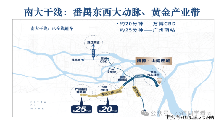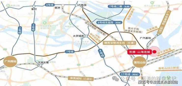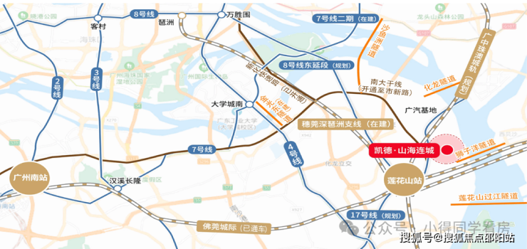 凯德山海连城紧连南大干线,往西可以通过番海大桥与佛山衔接,往东可通过拟建的莲花山通道与东莞相连,往南连接南沙新区,处于番禺双核心战略的重要载体莲花湾核心区,是科创源头番禺东莲花湾的一部分,联合广汽产业园、广州大学城、国际创新城等,构建千亿科创板块。