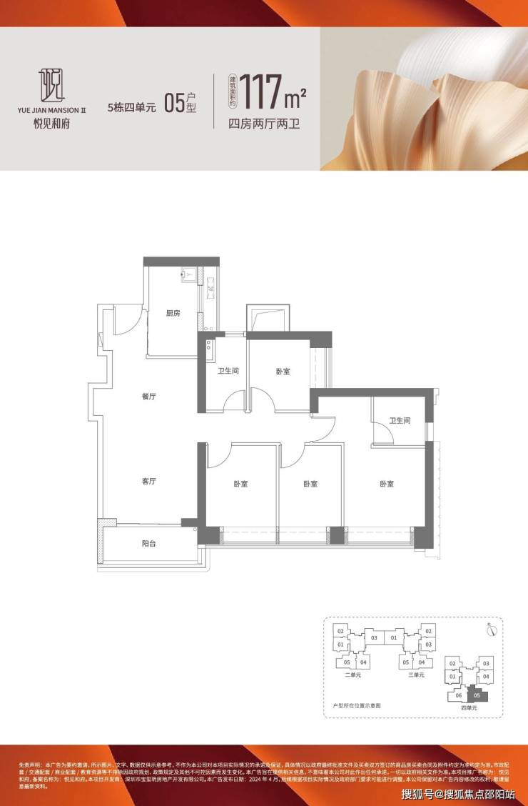 户型面积布局01/03129平四房两厅两卫设计的是竖厅南北通透格局,LDKB一体化设计,客厅4.9米开间,动静分区,L型厨房,公卫三段式分离设计,得房率:72.74%(不含赠送),阳台主朝东北向。