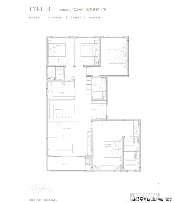 174产品为四房两厅三卫产品,打造了端户边厅布局,形成LDK一体化。无界的室内空间畅游体验,在平淡的日常里体验着生活的华章。