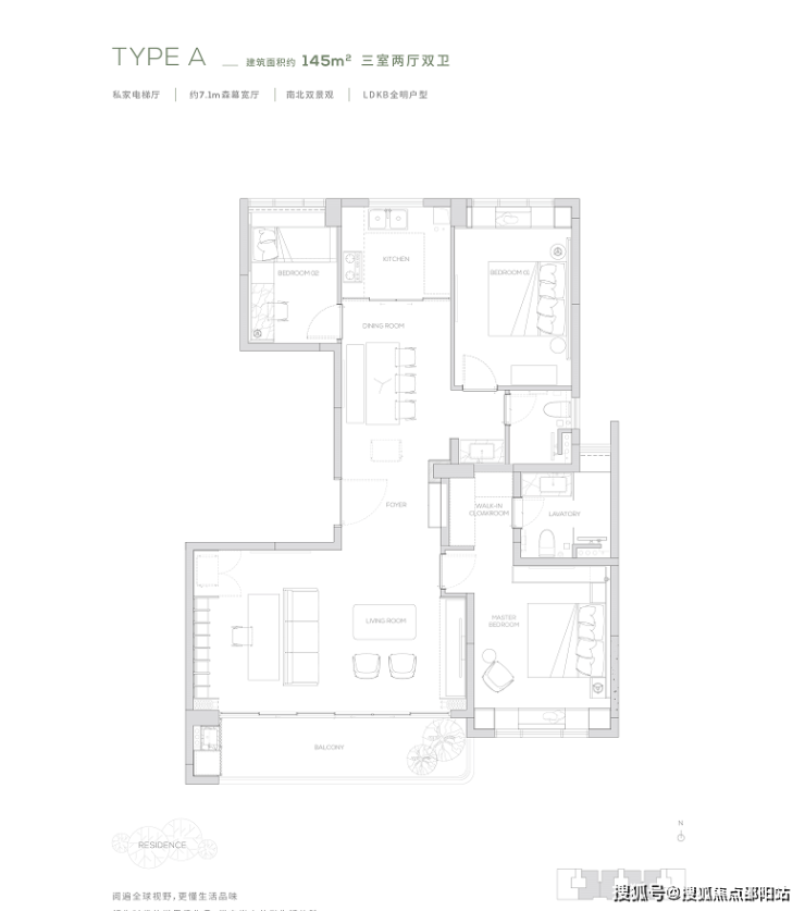 145产品为三房两厅两卫产品,餐厨一体化设计, 7米宽厅可切换各种生活场景,畅享宽幕般景观界面。