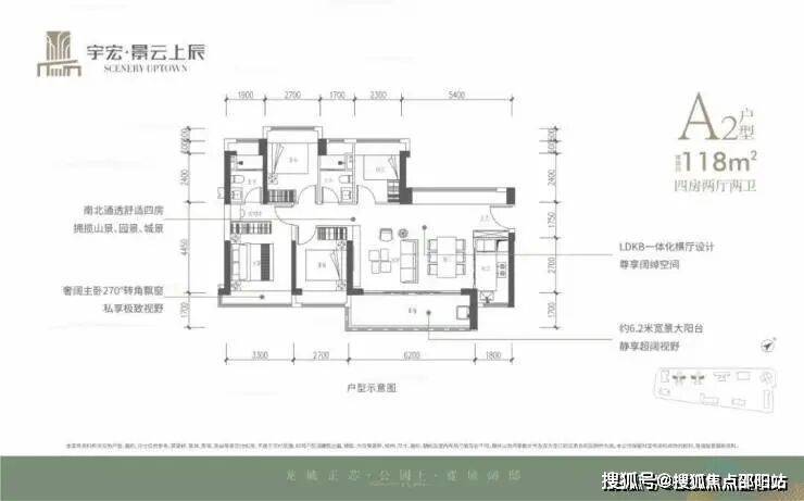 118㎡的4房2厅2卫,设计的是横厅南北通透格局,客餐厅6.2米开间,LDKB一体化,五开间朝南,西北面5.4米长的观景大飘窗,4个卧室分别做到了3.3米/2.7米/2.7米/2.3米的宽度,客厅连接餐厅位出6.2米长的大阳台,L型厨房,卫生间干湿分离,得房率约76%(不含赠送),东南朝向。