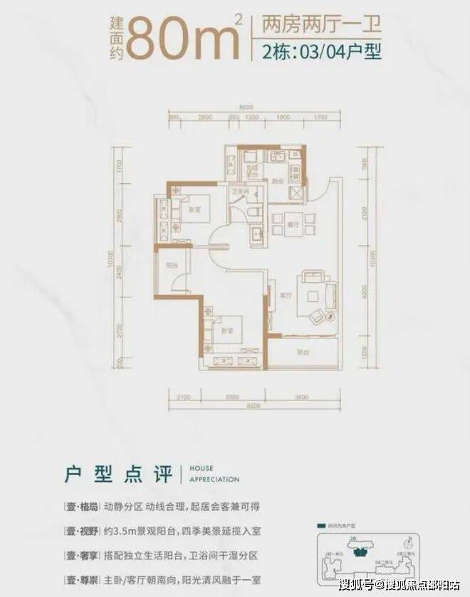 客厅朝南带阳台,主卧朝南,次卧朝西该户型分布在2栋03,04号房
