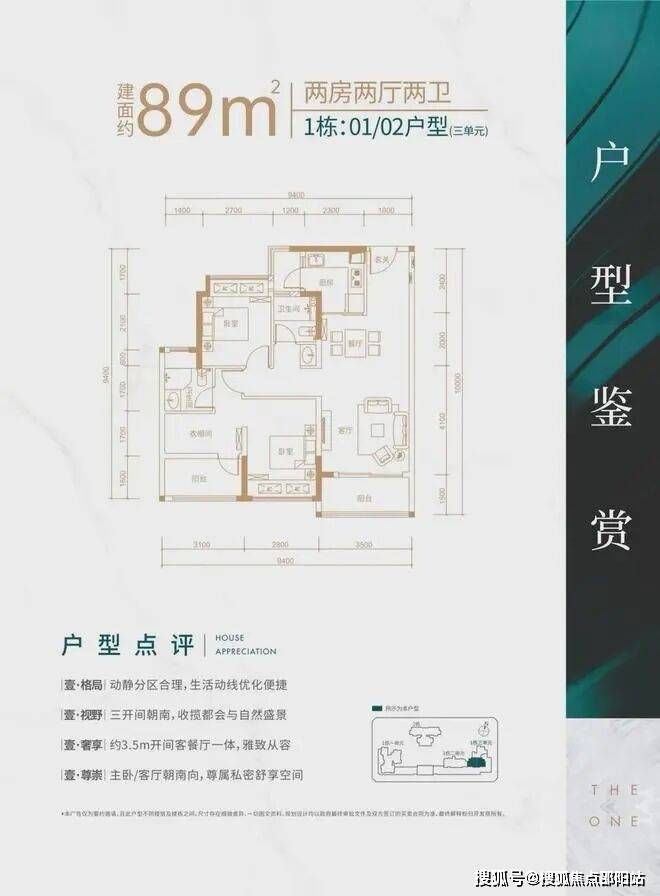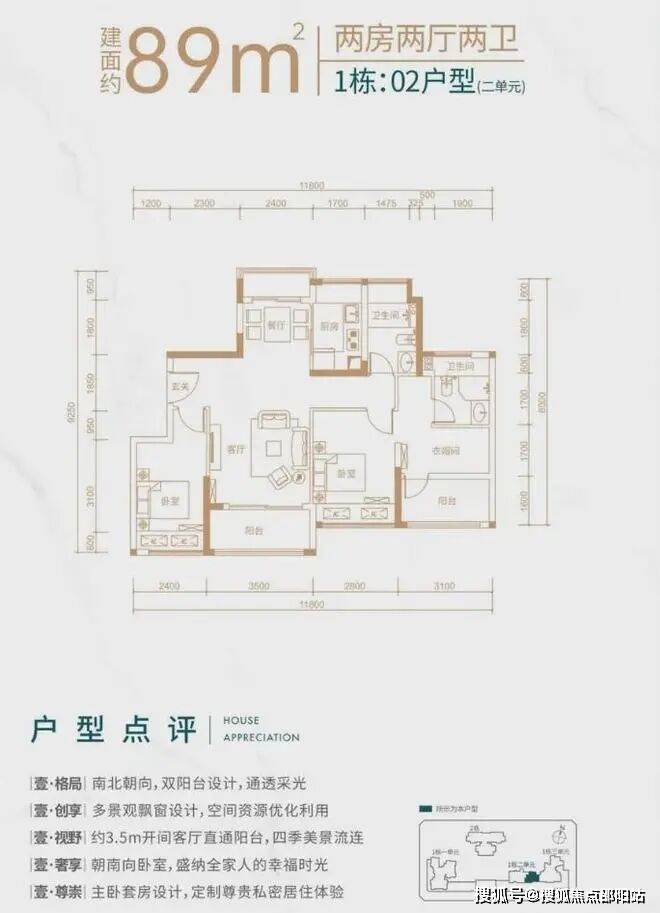 1栋2单元02户,南向通透户型,大开间短进深,所有居住空间南向,通风采光性能*。客厅开间3.5米带,有嵌入式阳台。主卧自然通透功能全面,居住空间开间进深比良好,空间利用充分。功能空间北向,采光充足。餐厅可向生活阳台扩展,入户玄关有良好的功能空间。