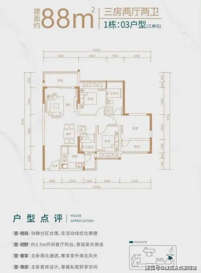 1栋三单元03号房,北向户型,动静分区布局,客厅开间3.5米带有1.5米进深阳台,主卧通透开间进深比良好,空间利用较为充分,南北双次卧,空间较为紧凑。居住空间通风效果较好,拥有良好的视野。