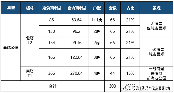 北塔T2为86-166㎡小户型,5梯8户,标准层层高3.3m,134-166㎡户型朝西向,景观可看一线海景,86-130㎡户型朝东向,看写字楼商业等城市景观;