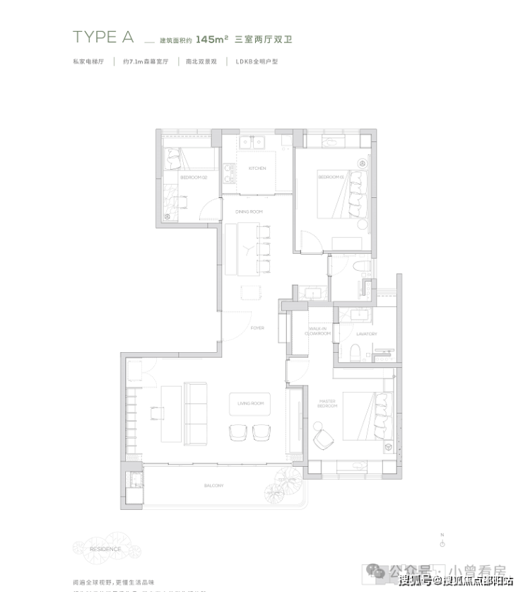 145产品为三房两厅两卫产品,餐厨一体化设计, 7米宽厅可切换各种生活场景,畅享宽幕般景观界面。