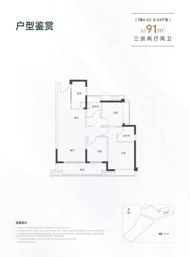 91㎡的3房2厅2卫,设计的是经典竖厅格局,进门入户玄关,LDKB一体化设计,三开间朝南,动静分区,客厅连接次卧出大阳台,L型厨房,公卫三段式分离,得房率约82%(不含赠送),东南朝向。