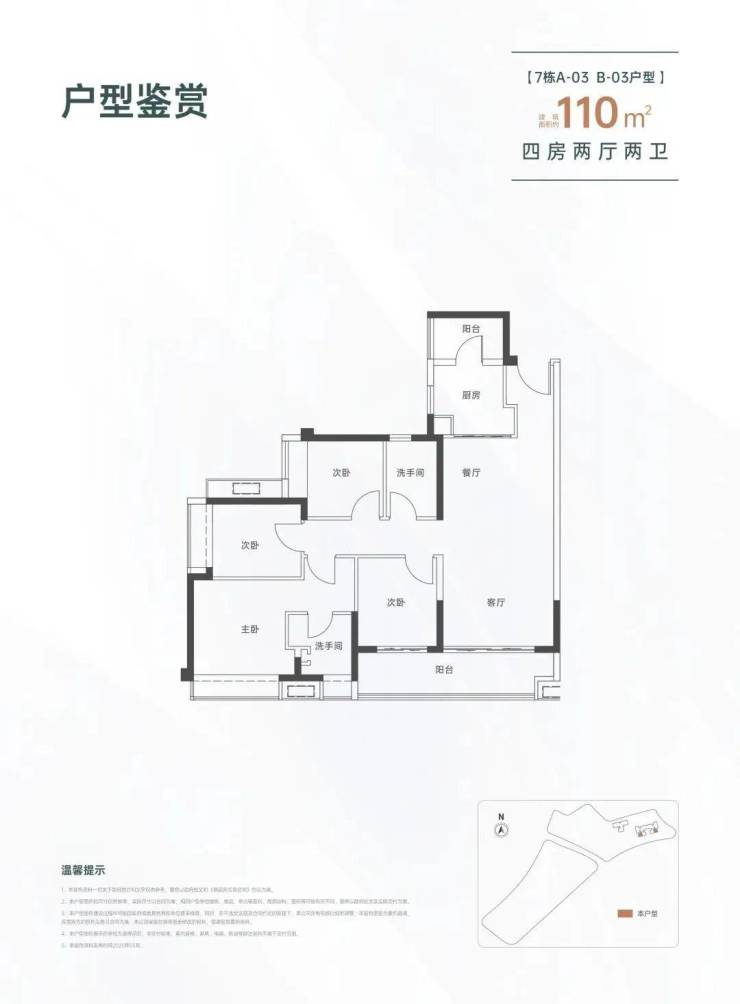 110㎡的4房2厅2卫,设计的是经典竖厅格局,进门入户玄关,LDKB一体化设计,四开间朝南,动静分区,客厅连接次卧出大阳台,L型厨房还带1个生活阳台,卫生间干湿分离,得房率约82%(不含赠送),东南朝向。