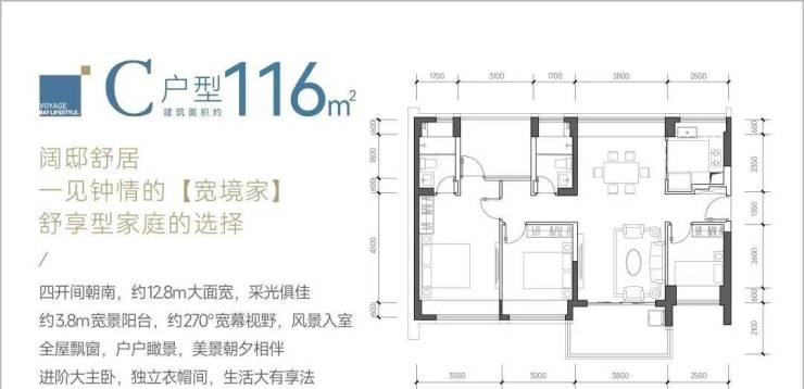 116㎡的4房2厅2卫,C户型,设计的是竖厅南北通透格局,餐客厅一体化设计,客厅3.8米开间,四开间朝南,4个卧室分别做到了主卧17.85㎡/次卧11.4㎡/次卧9.3㎡/次卧8㎡(包含墙体飘窗),都不用搭配飘窗做床,U型厨房,卫生间干湿分离,得房率约:93.13%(包含赠送),阳台主朝西南、东南或正南向。