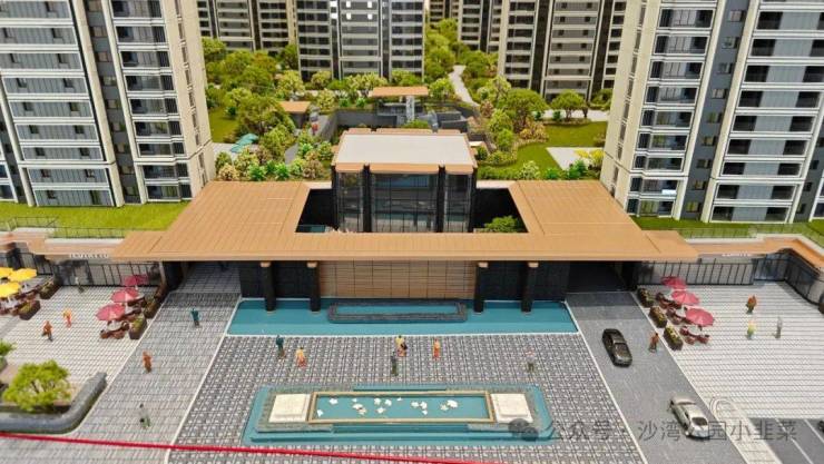 首先可以得知的是绿城玉海棠会做人车分流。笔者在总图发布时的文章里就已经预测绿城会将下沉式景观与落客区结合来做,现在模型展出,基本符合先前的判断。