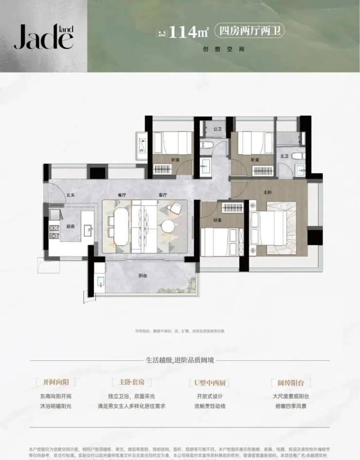 114平㎡的4房2厅2卫,设计的是横厅南北通透格局,进门入户玄关,LDKB一体化,五开间朝南,全屋9面飘窗,主卧大套间,U型厨房,卫生间干湿式分离,得房率约92%(包含赠送),阳台主朝东南向。