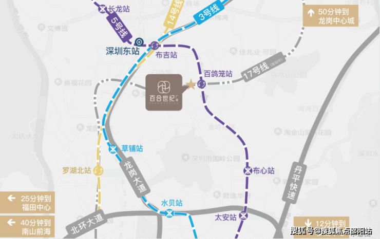 项目于5/17号线(建设中)百鸽笼站双地铁上盖,3/14号线环绕,1站瞬达罗湖,4站抵达福田芯。