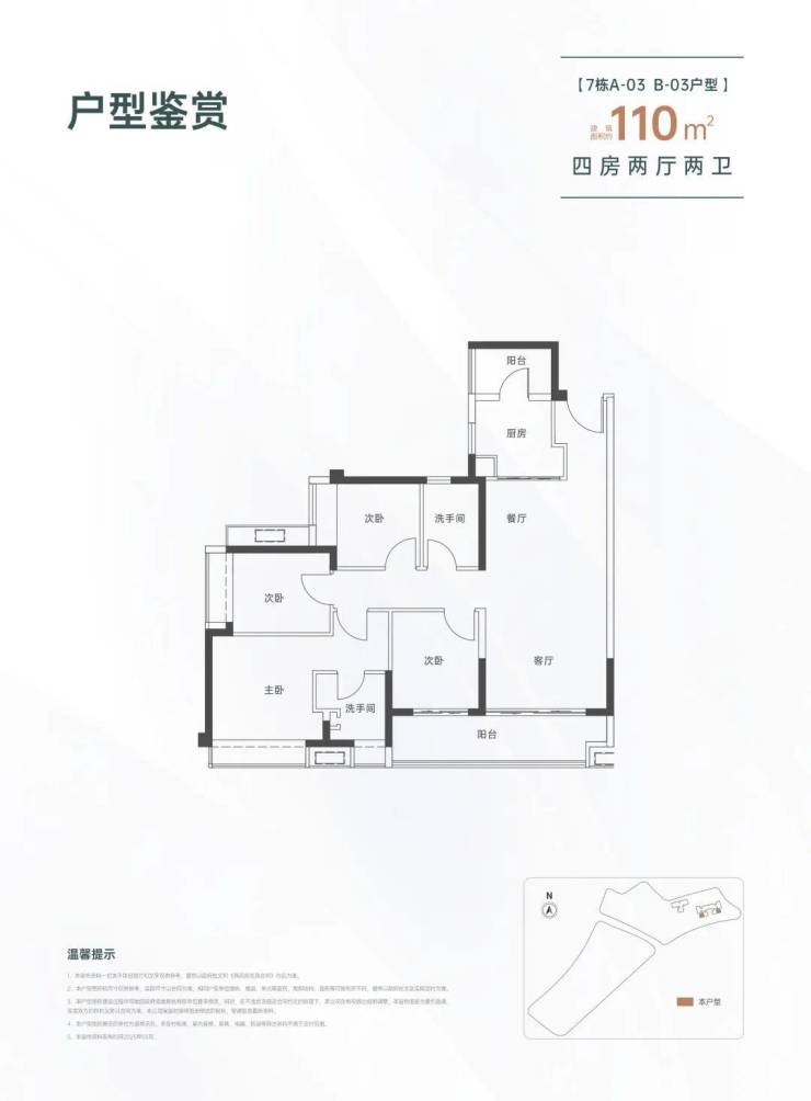 110㎡的4房2厅2卫,设计的是经典竖厅格局,进门入户玄关,LDKB一体化设计,四开间朝南,动静分区,客厅连接次卧出大阳台,L型厨房还带1个生活阳台,卫生间干湿分离,得房率约82%(不含赠送),东南朝向。