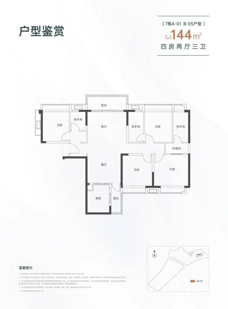 144㎡的4房2厅3卫,设计的是竖厅南北通透格局,进门入户玄关,LDKB一体化设计,双主卧套房,L型厨房还带1个生活阳台,公卫干湿分离,得房率约82%(不含赠送),阳台主朝西北向。