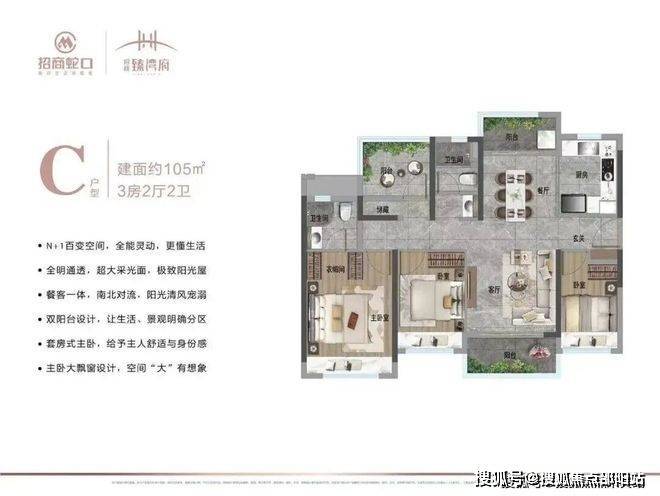 还有建面约105㎡的三房户型,不仅是单一的功能性居住,而且转向品质生活。