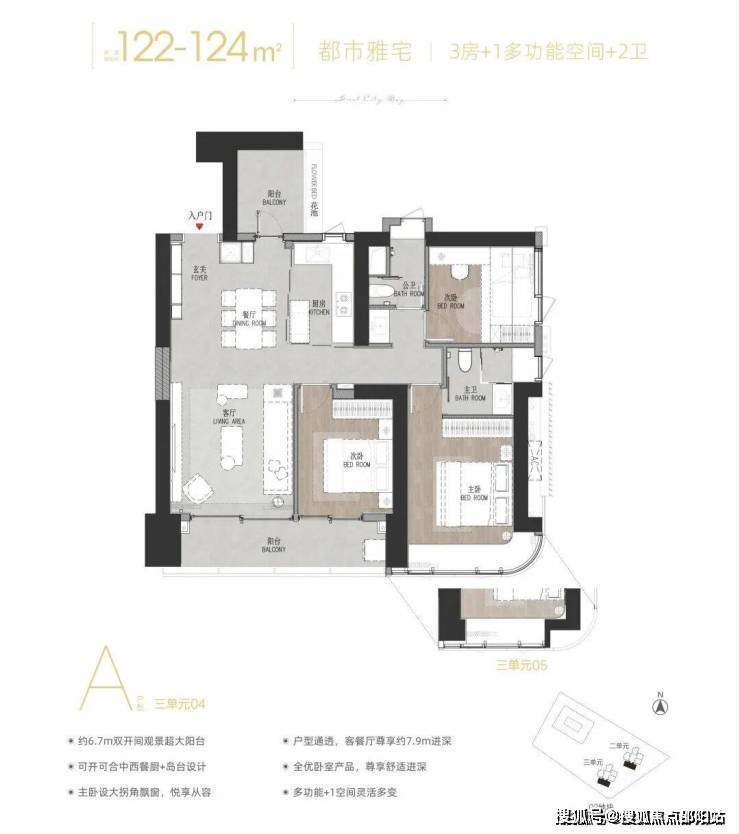 04/05 A户型——建面约122-124㎡3+1多功能空间: 竖厅户型,双阳台设计,西南朝向。