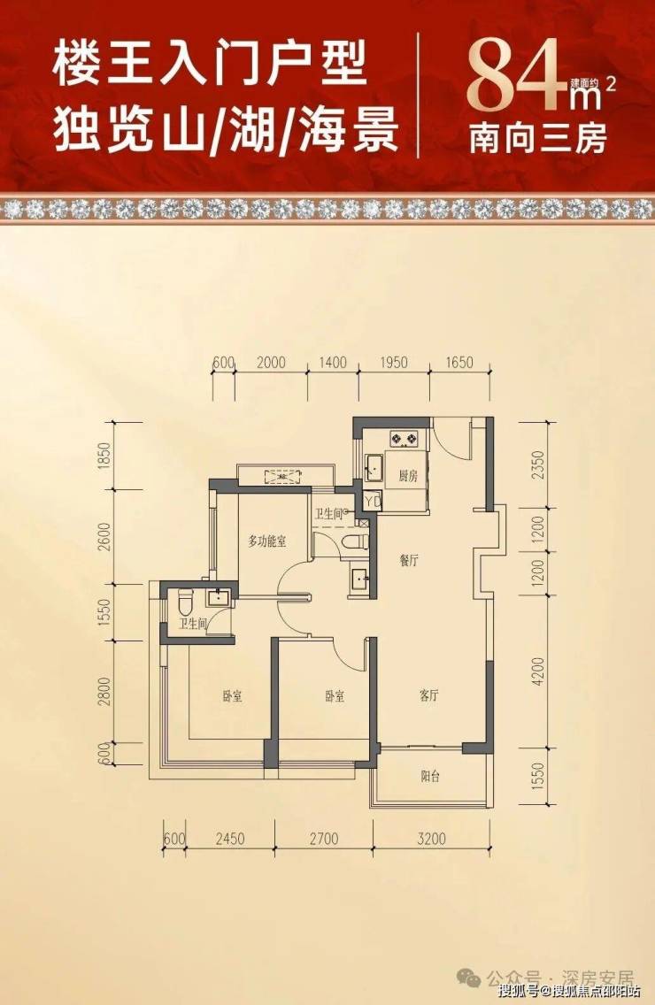 84㎡的3房2厅1卫,设计的是竖厅格局,客厅3.2米开间,LDKB一体化,S墙设计预留冰箱卡槽位,3个卧室分别做到了主卧10.37㎡/次卧9.18㎡/次卧7.54㎡(包含墙体飘窗),U型厨房,卫生间三段式分离,得房率约77%(不含赠送),东南或者西南朝向。