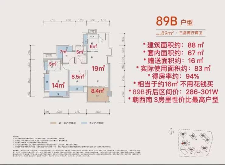 建筑面积约:89㎡,套内面积约:67㎡,赠送面积约:16㎡,实际使用面积约:83㎡,得房率约:94%,相当于约16㎡ 不用花钱买,朝西南 3房里性价比最高户型。