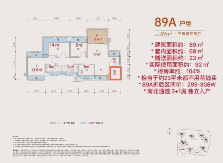 建筑面积约:89㎡,套内面积约:69㎡,赠送面积约:23㎡,实际使用面积约:92㎡,得房率约:104%,相当于约23㎡都不用花钱买,南北通透 3+1房 独立入户。