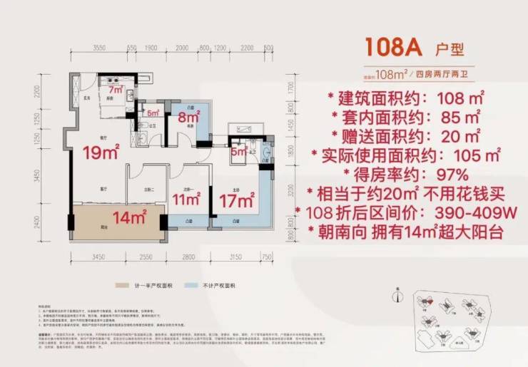 建筑面积约:108㎡,套内面积约:85㎡,赠送面积约:20㎡,实际使用面积约:105㎡,得房率约:97%,相当于约20㎡不用花钱买,朝南向 拥有14㎡超大阳台。