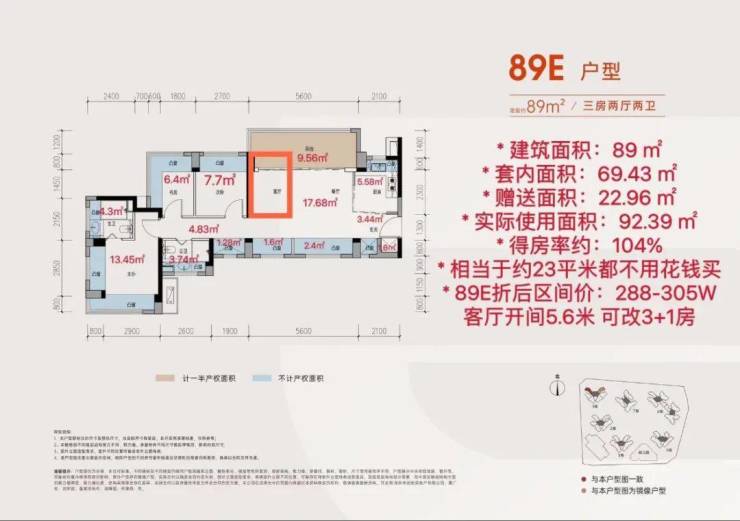 建筑面积:89㎡,套内面积:69.43㎡,赠送面积:22.96㎡,实际使用面积:92.39㎡,得房率约:104%,相当于约23㎡,都不用花钱买,客厅开间5.6米 可改3+1房。