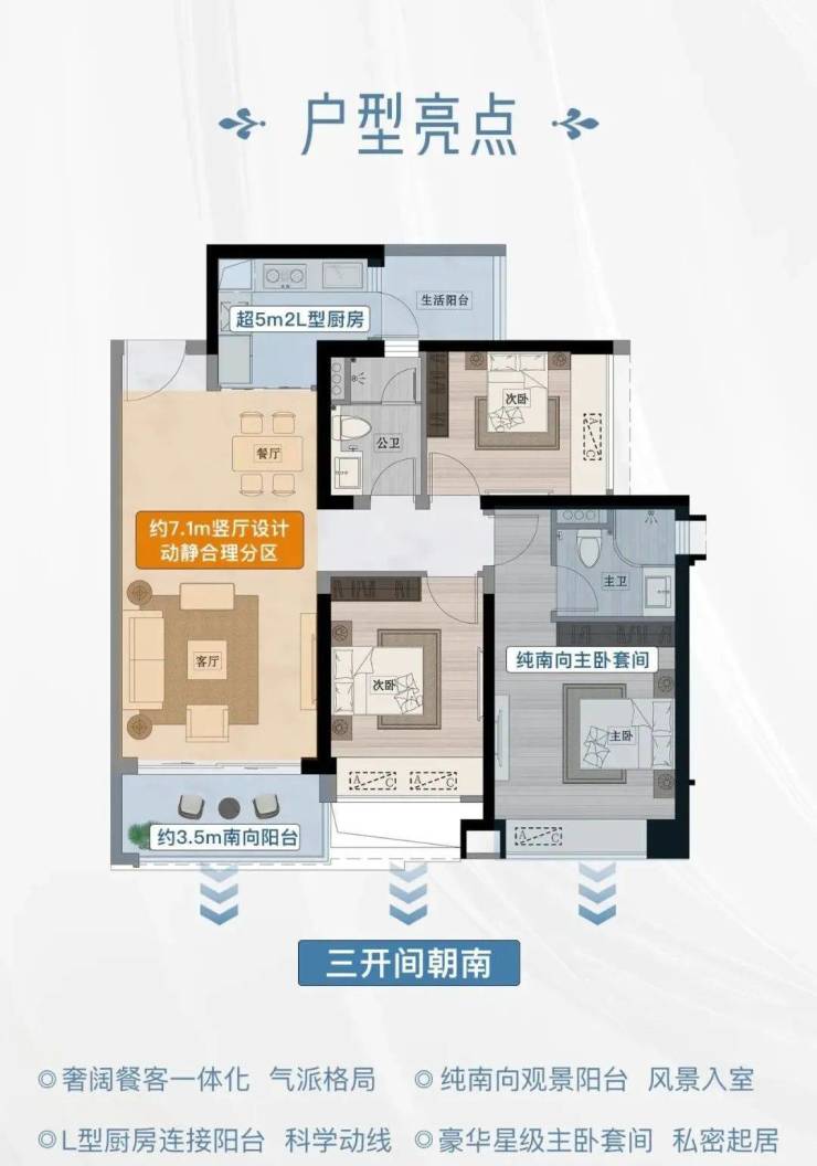 奢阔餐客双厅 · 纯南阳台 · L 型厨房 · 豪华主卧套间