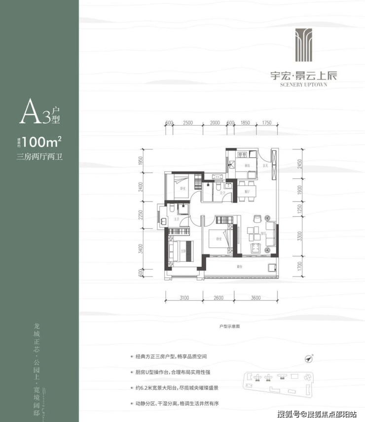 100㎡的3房2厅2卫,设计的是竖厅格局,客厅3.6米开间,LDKB一体化,三开间朝南,3个卧室分别做到了3.1米/2.6米/2.4米的宽度,客厅连接次卧出6.2米长的大阳台,U型厨房,卫生间干湿分离,得房率约76%(不含赠送),东南朝向。
