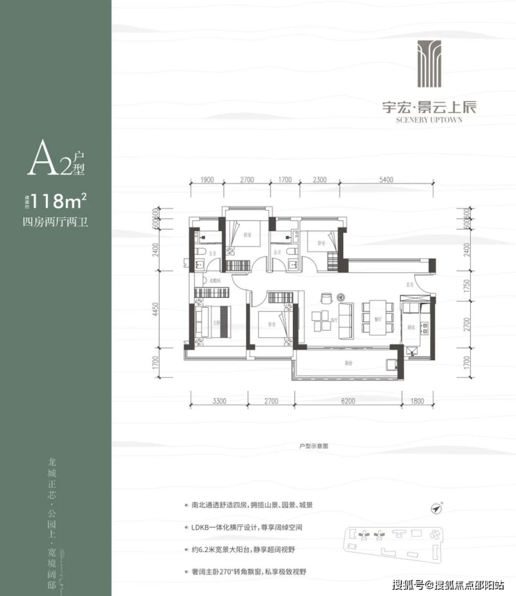 118㎡的4房2厅2卫,设计的是横厅南北通透格局,客餐厅6.2米开间,LDKB一体化,五开间朝南,西北面5.4米长的观景大飘窗,4个卧室分别做到了3.3米/2.7米/2.7米/2.3米的宽度,客厅连接餐厅位出6.2米长的大阳台,L型厨房,卫生间干湿分离,得房率约76%(不含赠送),东南朝向。