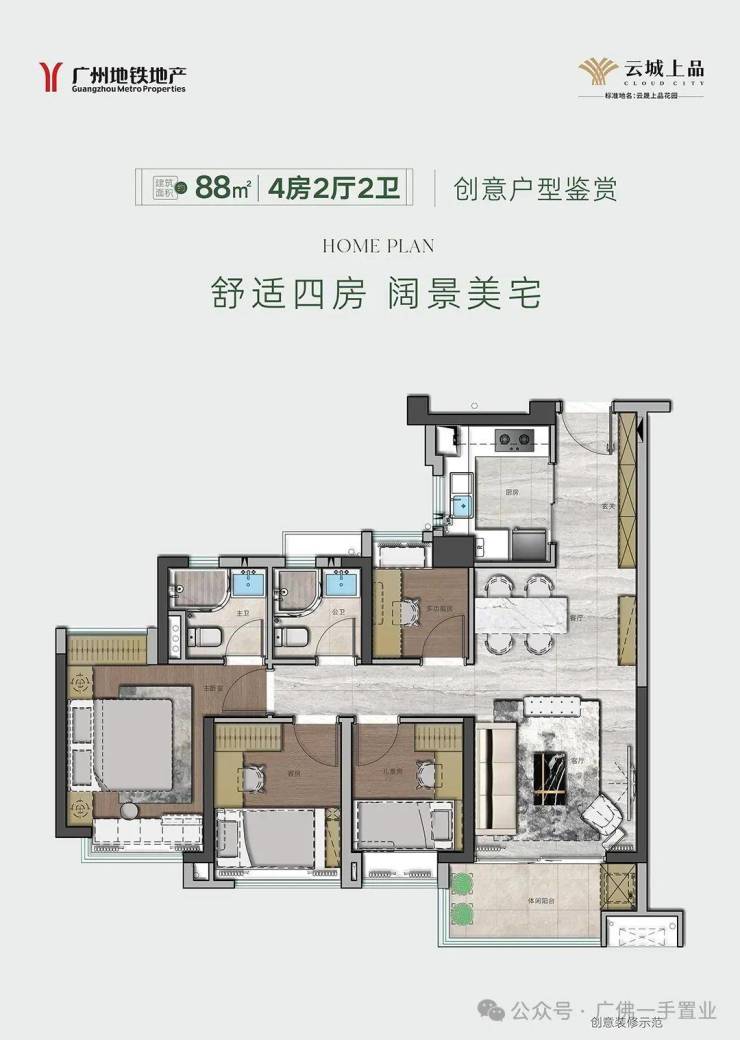 建面约【88㎡四房】更大空间+灵活改造空间,四开间朝南,主卧多了独立卫生间,私密性更强,双卫生间也让家人起居更方便。广州云城上品售楼处电话:400-150-5057