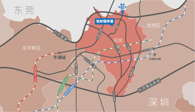 三横两纵核心路网:三横(外环高速,串联沙井、光明、龙岗、坪山;龙平西路,直达大运;凤清凤观路,联通凤观路直达观澜)两纵(凤深大道,联通外环高速;东深路,联通丹平快速直达罗湖)