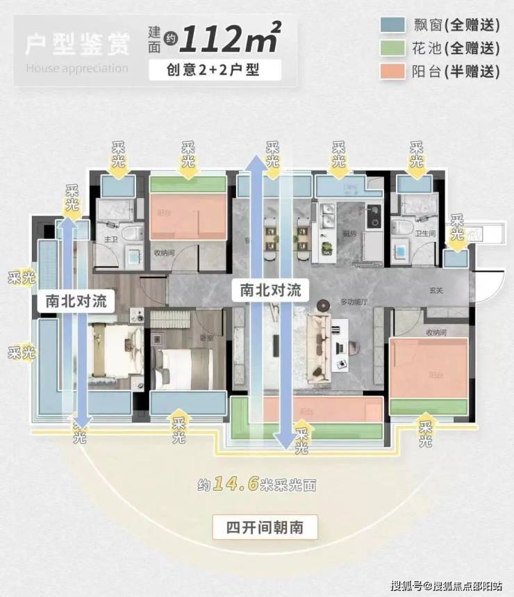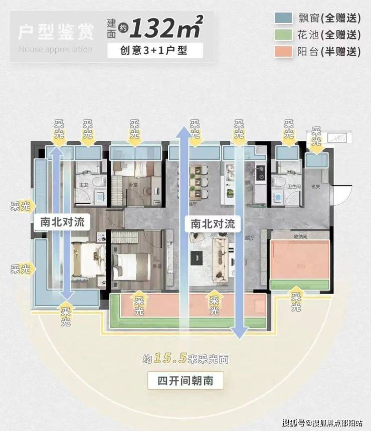 同面积段中罕见四开间朝南,南北通透,沐光格局