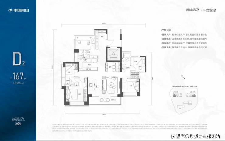 167㎡的5房2厅3卫,1栋02/2栋03高区户型,电梯入户送独立公区,设计的是竖厅双龙抱珠格局,四开间朝南,超宽敞客厅巨幕阳台,主卧大套间设计,U型厨房,双公卫三段式分离,得房率:72.07%(不含赠送),西南朝向。