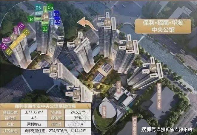 保利招商华发中央公馆采用了围合式设计,6栋47层高塔楼设计,小区自身配建有文化体育场馆和幼儿园,除了2#楼王是两梯四户,其余均为三梯六户。