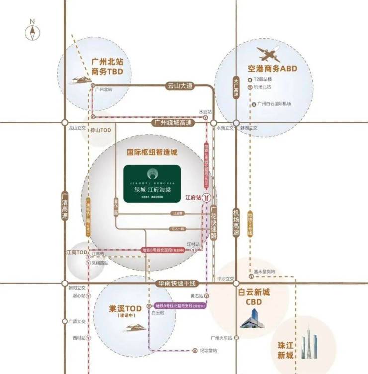 800米可到双地铁8号线北延段/北延段支线【江府站】,目前工程进度2%,未来坐地铁6站珠江新城CBD,10站北京路商圈、直达广州市政府,每年达50-100万人流量。