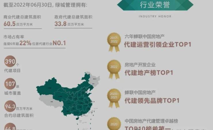 绿城管理:秉承“品质、信任、效益、分享“的核心价值观,以“管理创造价值”为服务理念。通过项目管理整合资源、输出品牌及标准,以定制化的解决方案合高品质的服务,为客户创造价值。业务涵盖全国107个城市,管理390个项目,连续六年位于代建行业首位。