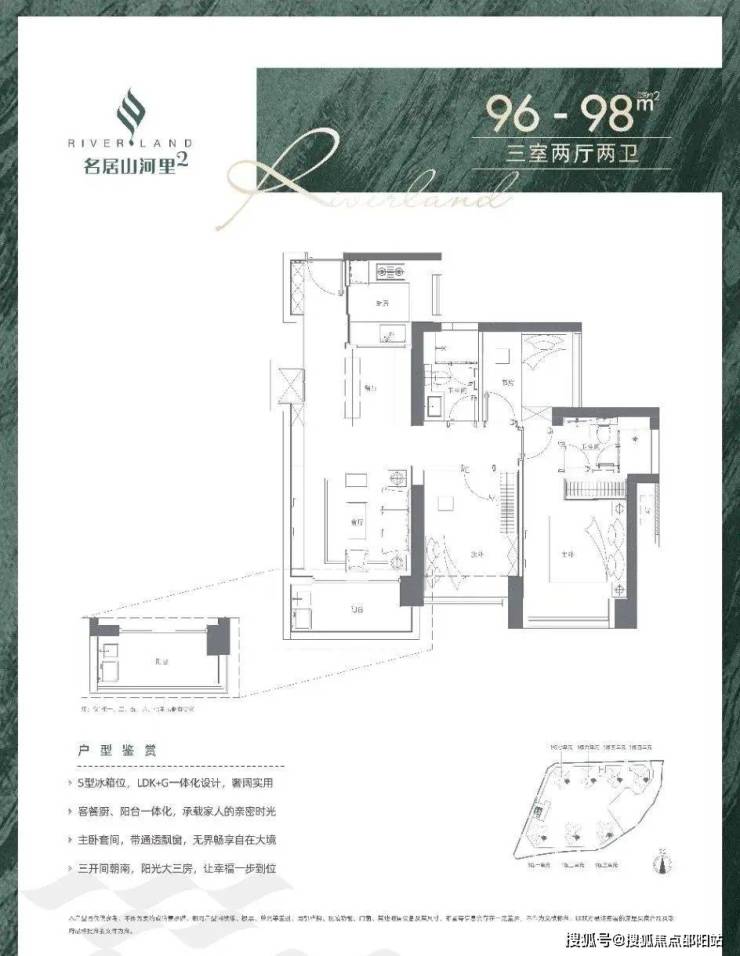 98㎡的3房2厅2卫,1-7单元05户型,设计的是经典竖厅格局,餐客厅一体化,客厅3.5米开间,S墙设计预留冰箱位,三开间朝南,3个卧室分别做到了主卧12.39㎡/次卧9.54㎡/次卧6.11㎡(实测面积,去掉墙体),U型厨房,得房率:73.86%(不含赠送),阳台1.5米进深,东南朝向。