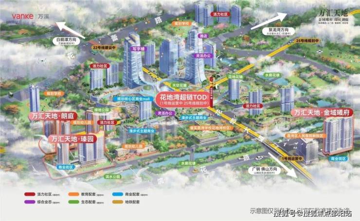 交通配套:公共交通,花地湾TOD交通枢纽就在项目旁边,可以实现地铁1号线和规划的25号线换乘。