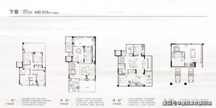户型:悦融居(商业):有 310-330㎡大平层、183-263㎡上叠、400-515㎡下叠。
