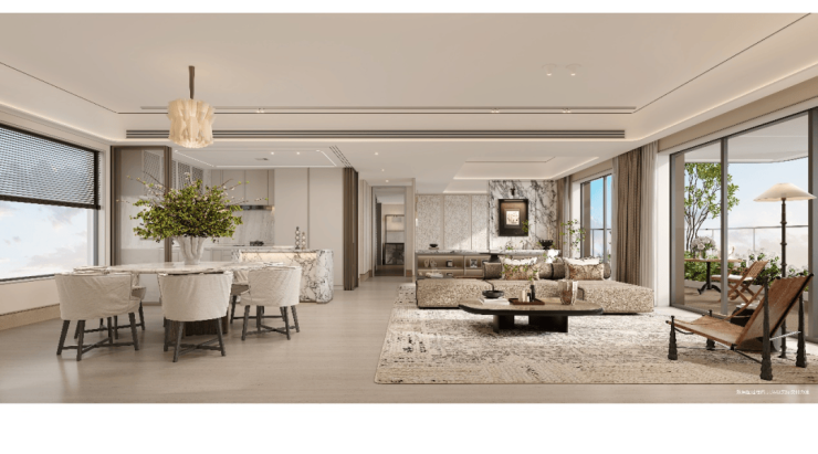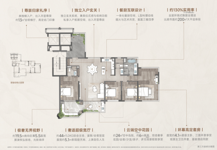 约33平方米“LDKG”横厅(将客厅、餐厅、厨房和阳台这四个公共区域融合在一起的住宅户型设计)面宽达17.6米,搭配6米挑高空中浮岛花园。
