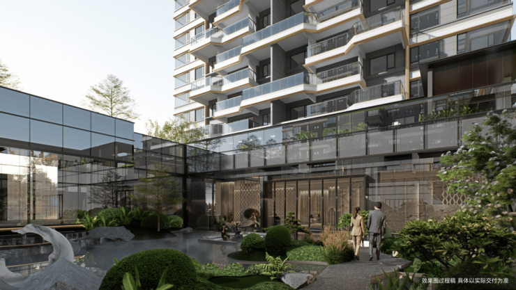 社区双重立体园林——上浮的“三境七颂”东方奢境与下沉约600平方米琉璃光苑——通过约10米巨幕飞瀑串联,将园林变成流动的圈层秀场,每一步皆尊贵。