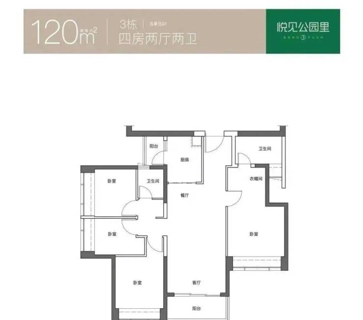 120㎡的4房2厅2卫,仅3栋5单元01户型,设计的是创新式双龙抱珠格局,L型厨房,公卫三段式分离,得房率74.13%(不含赠送),东南朝向。