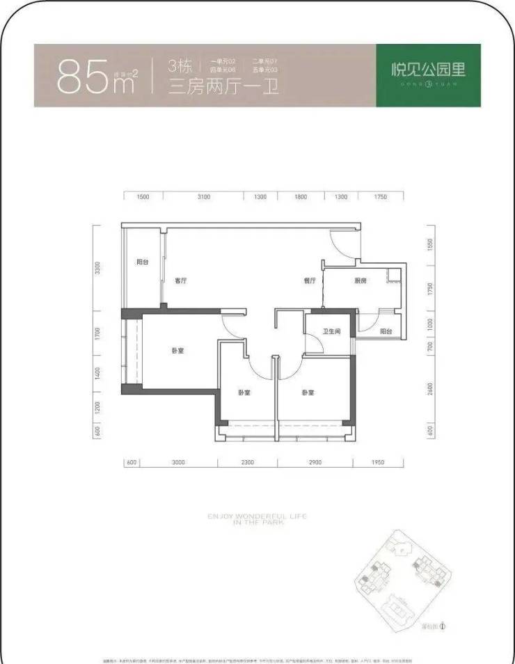 85㎡的3房2厅1卫,设计的是竖厅格局,客厅3.3米开间,LDKB一体化设计,3个卧室分别做到了3.1米/2.9米/2.3米的宽度,L型厨房带1个生活阳台,卫生间三段式分离,得房率73.72%(不含赠送),西北或东南朝向。